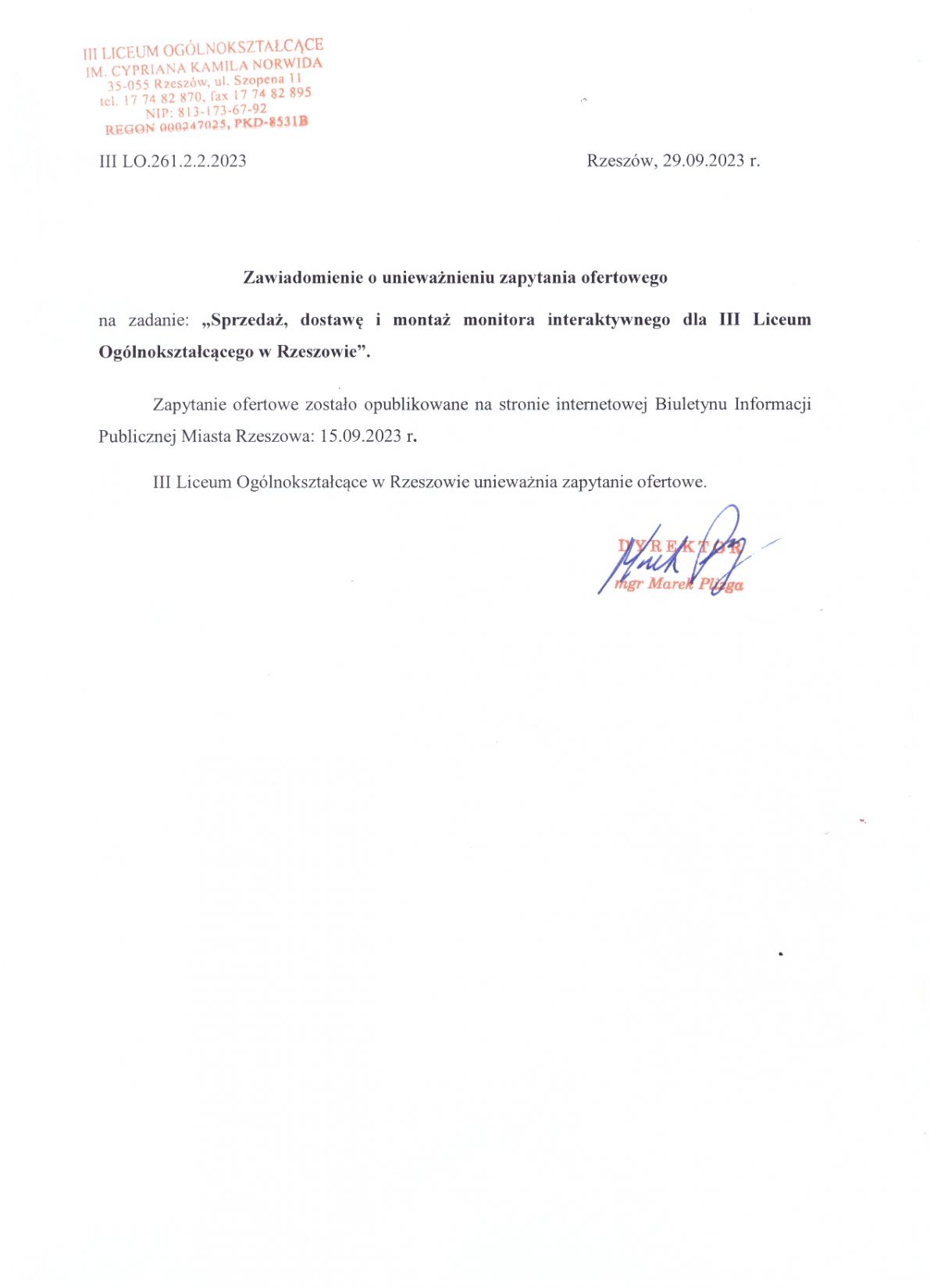 Zawiadomienie o unieważnieniu zapytania ofertowego na zadanie,,Sprzedaż, dostawa i montaż monitora interaktywnego dla III LO"