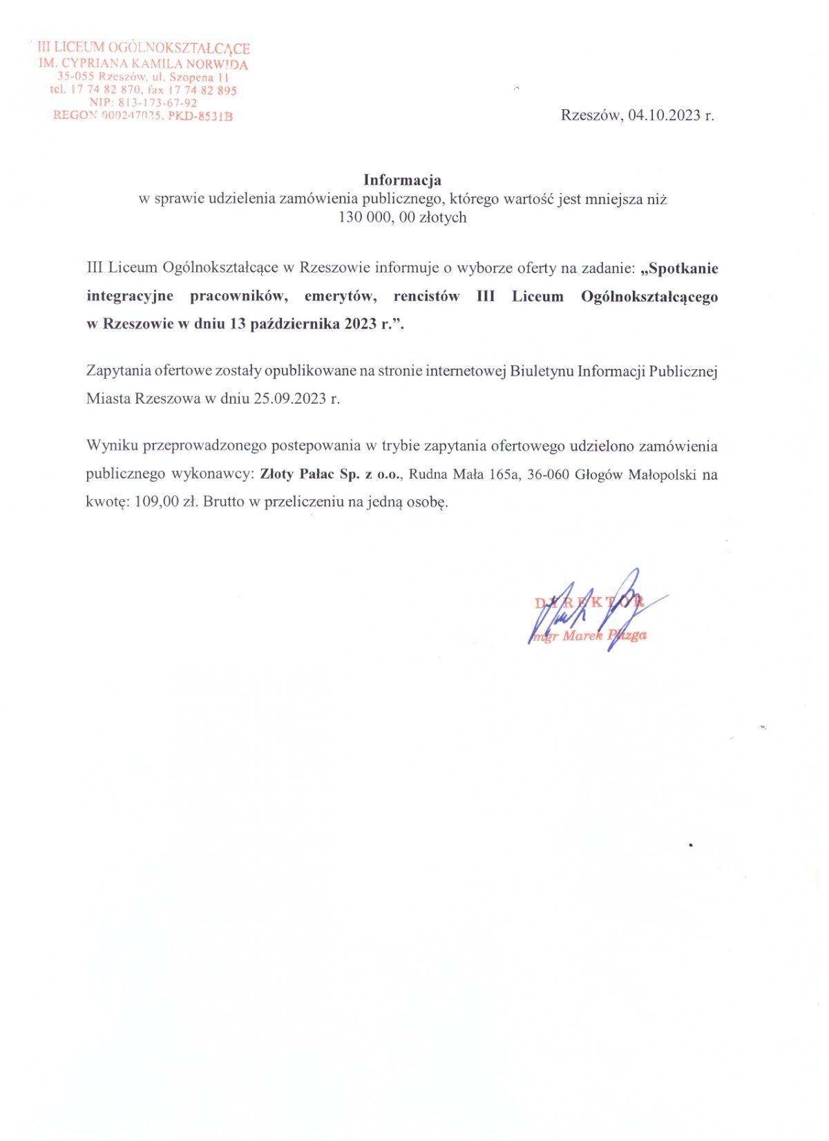 Zawiadomienie o wyborze oferty,, Spotkanie integracyjne pracowników, emerytów, rencistów III Liceum Ogólnokształcącego"