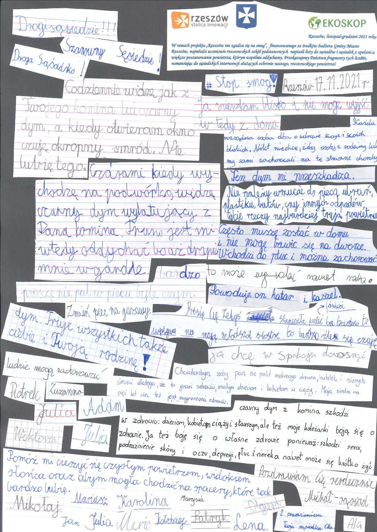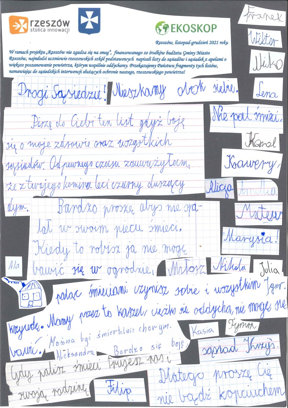 Do pięciu szkół podstawowych przekazano pakiety 220 listów obywatelskich „Drogi sąsiedzie” opracowanych na podstawie oryginalnych listów dzieci celem omówienia ich na godzinach wychowawczych i wykonania akcji promowania wśród mieszkańców Rzeszowa (właścicieli domów jednorodzinnych z piecami węglowymi C.O.) proekologicznych postaw, wymiany pieców na gazowe, zakazu spalania w piecach c.o. odpadów. Listy trafiły do 220 mieszkańców, właścicieli domków jednorodzinnych na osiedlach: Staromieście, Pogwizdów Nowy, Staroniwa, Przybyszówka i Matysówka. Kopie listów trafiły do Wydziału Edukacji i Wydziału Ochrony Środowiska Urzędu Miasta Rzeszowa oraz do lokalnych mediów.