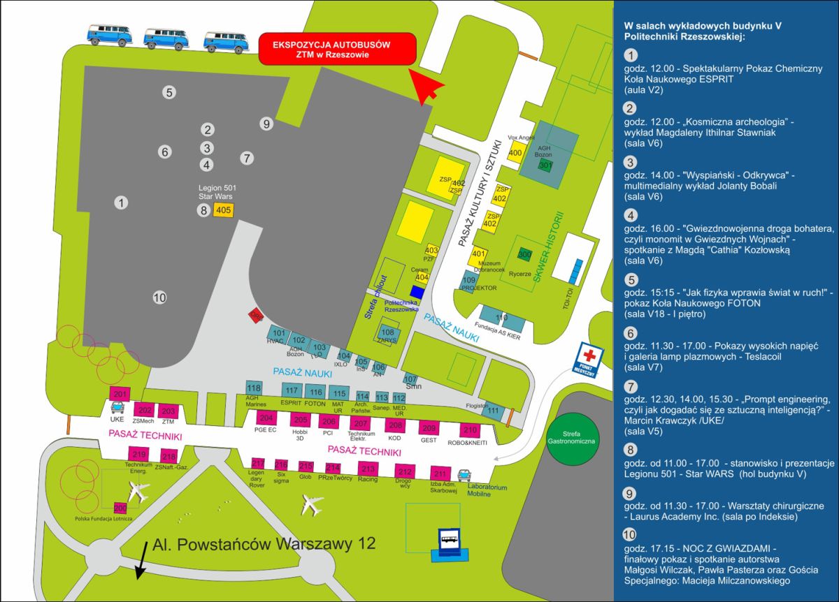 Miasteczko Piknikowe - od. godz. 11.00 do 17.00 - zlokalizowane będzie tradycyjnie wokół głównego budynku Rektoratu Politechniki Rzeszowskiej. Wykłady i część pokazów prezentowane będą w aulach i salach wykładowych (budynek V). Wstęp wolny, wszystkie atrakcje dostępne nieodpłatnie.