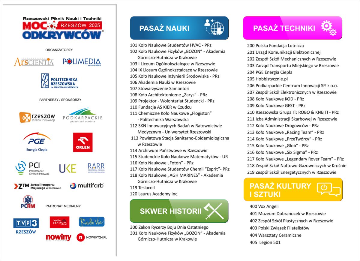 Czekają na Was 4 strefy tematyczne: Pasaż Techniki, Pasaż Nauki, Pasaż Kultury i Sztuki oraz Skwer Historii. A w nich moc naukowych atrakcji. Koła naukowe Politechniki Rzeszowskiej, Uniwersytetu Rzeszowskiego, Politechniki Warszawskiej, Akademii Górniczo-Hutniczej w Krakowie i Uniwersytetu im. Komisji Edukacji Narodowej z Krakowa prezentować będą swój dorobek naukowy i popularnonaukowy. Uczniowie ze szkół podstawowych, liceów i techników zademonstrują eksperymenty z chemii i fizyki, a także projekty edukacyjne z robotyki.
