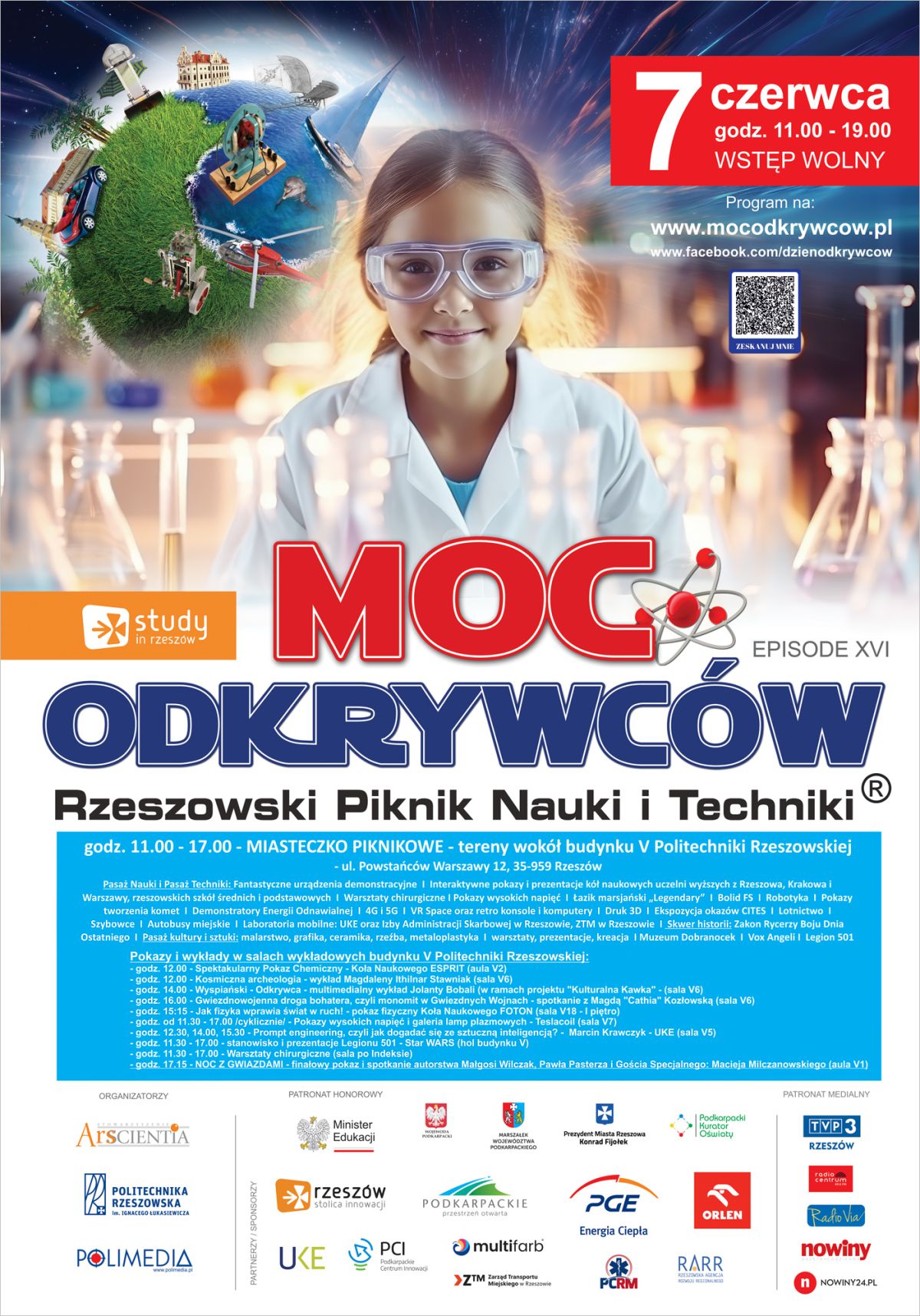 „MOC ODKRYWCÓW - Rzeszowski Piknik Nauki i Techniki" - edycja XVI, zaplanowana jest na sobotę 7 czerwca 2025 r. od godz. 11.00 do 19.00 w Rzeszowie.