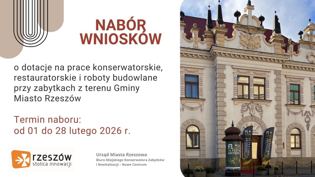 - Nabór wniosków na dotacje celowe z budżetu Miasta Rzeszowa na prace konserwatorskie, restauratorskie lub roboty budowlane przy zabytkach wpisanych do rejestru zabytków, położonych w obszarze Gminy Miasta Rzeszów, niestanowiących jej wyłącznej własności w roku 2026, potrwa od 1 do 28 lutego 2026 r.