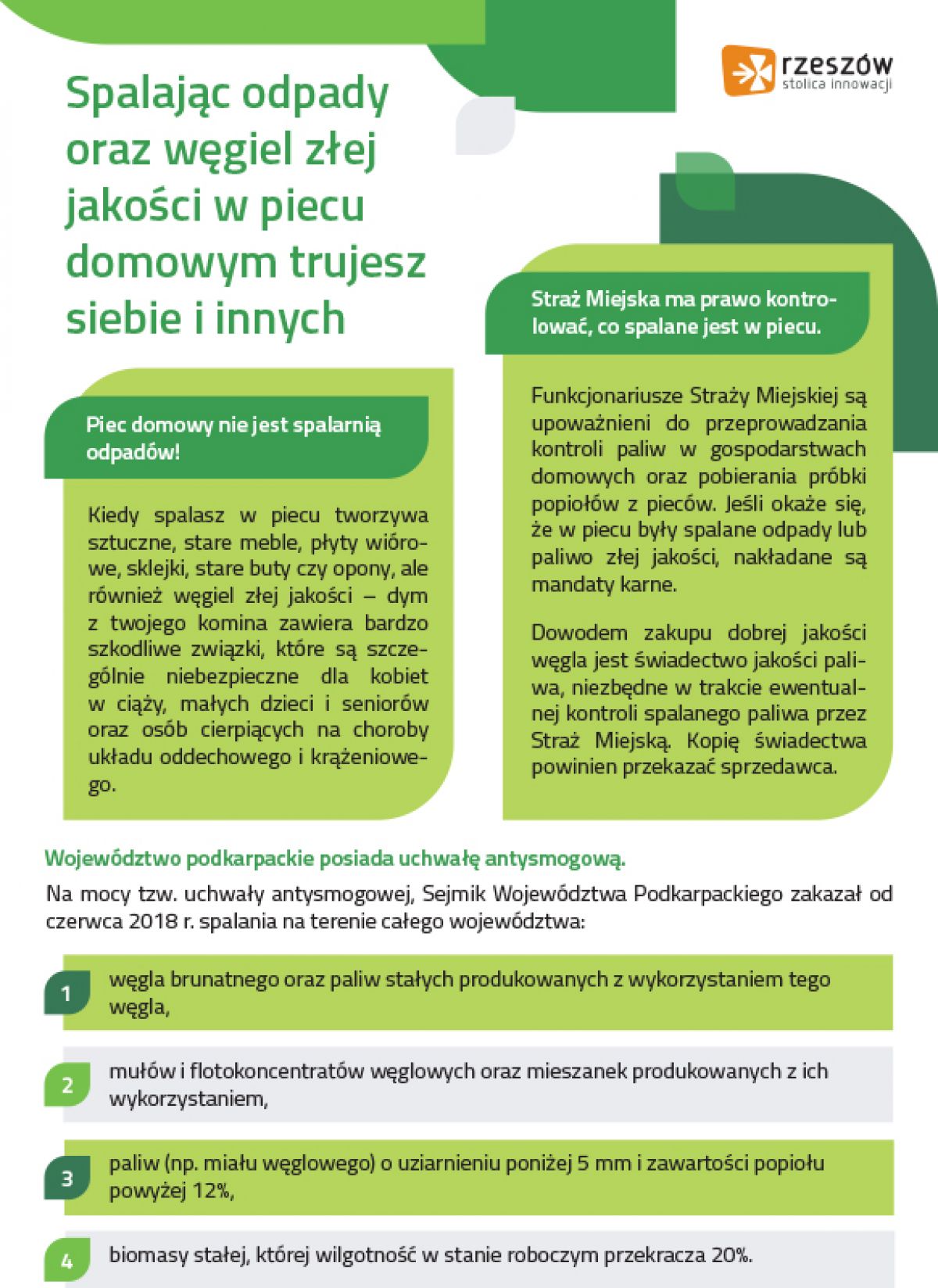 W Województwie Podkarpackim obowiązuje uchwała antysmogowa. Na mocy tzw. uchwały antysmogowej, Sejmik Województwa Podkarpackiego zakazał od czerwca 2018 r. spalania na terenie całego województwa podkarpackiego i przez cały rok kalendarzowy: