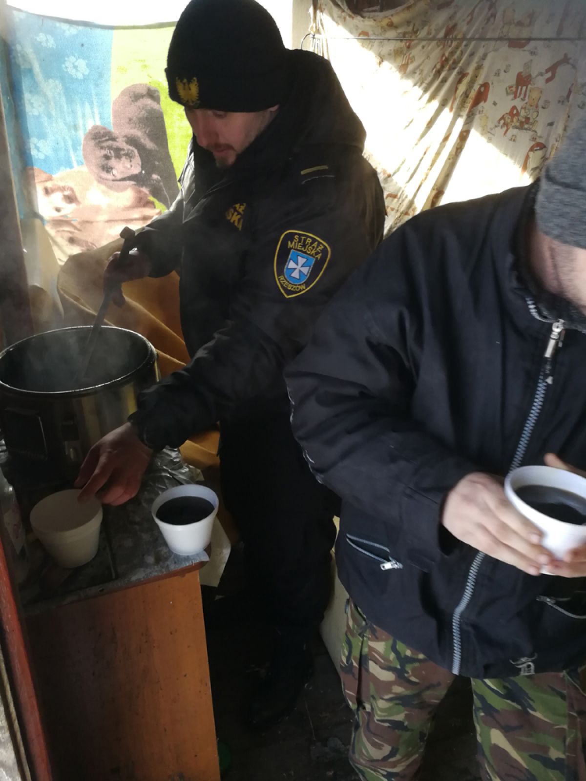 Od kilku dni strażnicy prowadzą dodatkowe patrole miejsc, w których najczęściej gromadzą się osoby bezdomne. To m.in. tereny ogródków działkowych, pergole, okolice mostów i wiaduktów oraz pustostany. Przez święta patrol straży miejskiej rozwoził im ciepłe posiłki i herbatę.