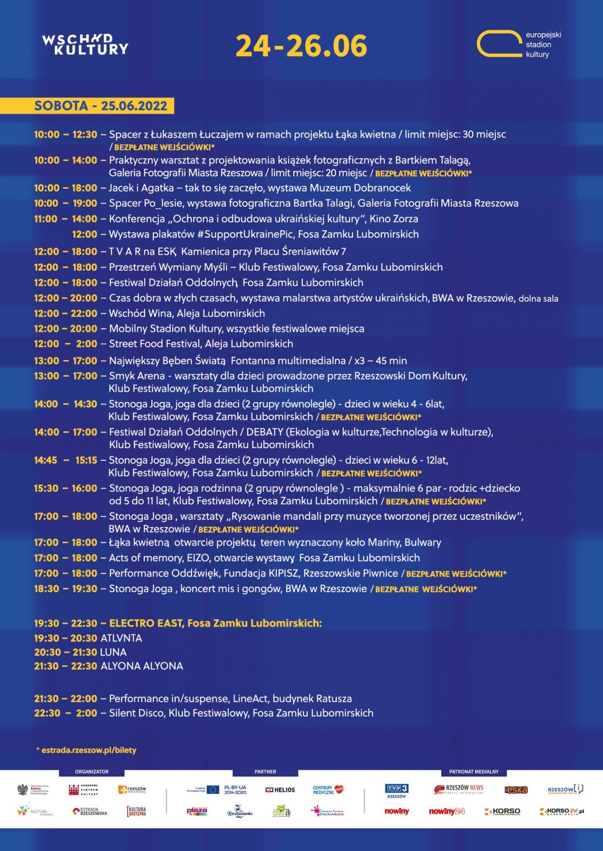 Więcej szczegółów dotyczących programu ESK 2022 będzie dostępnych już wkrótce. Rzeszowski festiwal od 2013 roku jest częścią większego projektu – festiwalu Wschód Kultury integrującego środowiska artystyczne miast Polski Wschodniej (Rzeszów, Lublin, Białystok) i artystów krajów Partnerstwa Wschodniego (m.in. Ukraina, Gruzja, Armenia).