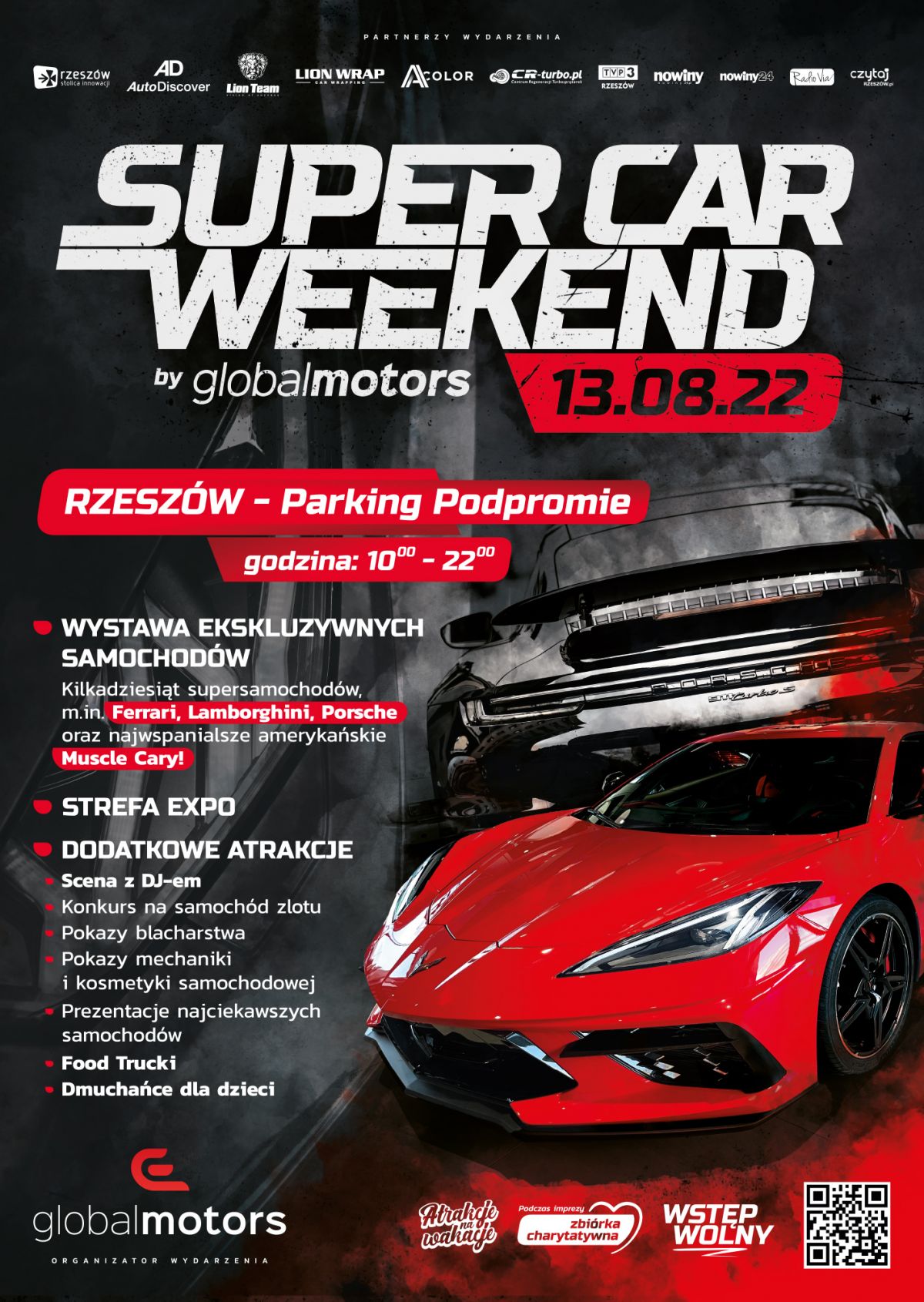 Global Motors - salon samochodowy marek Premium w Rzeszowie (Al. Armii Krajowej 21) wraz z partnerami wydarzenia zapraszają na SUPER CAR WEEKEND by Global Motors! Impreza odbędzie się już w najbliższą sobotę 13 sierpnia na parkingu Podpromie - w samym sercu Rzeszowa! WSTĘP WOLNY i BEZPŁATNY dla wszystkich miłośników czterech kółek i pomagania!