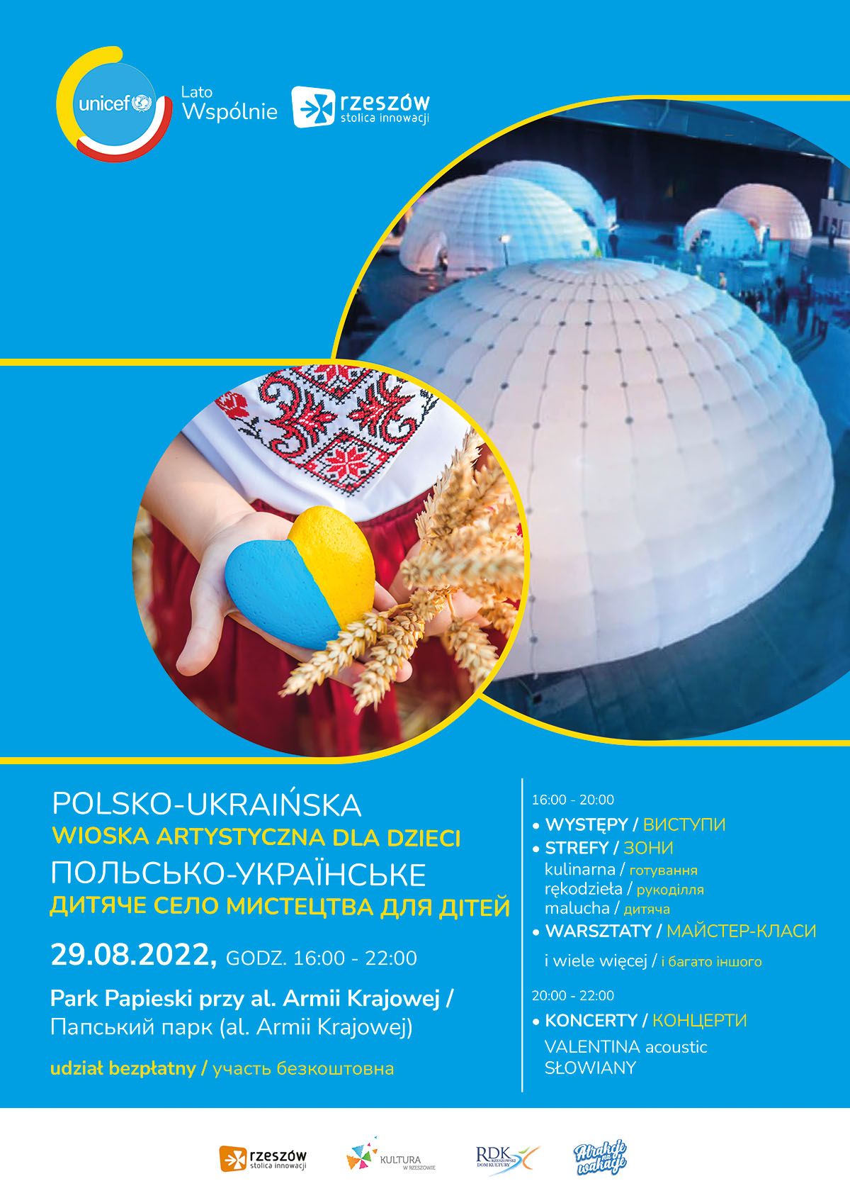 Rzeszowski Dom Kultury zaprasza wszystkich mieszkańców na wielkie pożegnanie wakacji, które odbędzie się w ramach Polsko-Ukraińskiej Wioski Artystycznej dla Dzieci. Plenerowa impreza odbędzie się w poniedziałek 29 sierpnia 2022 roku w Parku Papieskim w Rzeszowie. Wydarzenie jest finansowane ze środków UNICEF i udział w nim jest bezpłatny.