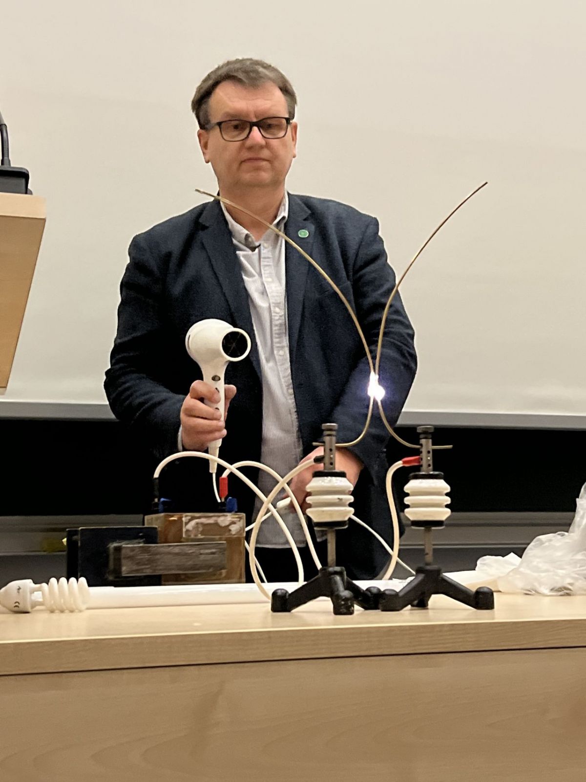 Podczas pierwszego wykładu zatytułowanego „Dlaczego żarówka świeci a prąd kopie?” uczestnicy przekonali się, że elektryczność jest wszędzie wokół nas, dlatego też jej brak znacznie utrudniłby nam codzienne funkcjonowanie. Dzięki przeprowadzonym doświadczeniom i pokazom studenci mogli zobaczyć, że również ludzie są całkiem niezłym przewodnikiem prądu, ale także dowiedzieli się kilku elektrycznych ciekawostek m.in. jak za pomocą prądu można oszukać kompas, czy każda woda jest dobrym przewodnikiem prądu oraz czy ogórek kiszony może „zaświecić”. Mimo, że eksperymenty momentami wprowadzały atmosferę „wysokiego napięcia”, prowadzący zadbał o bezpieczeństwo przypominając przy tym, że z prądem nie należy żartować. Pytań, oklasków jak i chętnych do udziału w fizycznych doświadczeniach nie brakowało. Wykład poprowadził dr Witold Zawadzki, na co dzień pracujący w Instytucie Fizyki Uniwersytetu Jagiellońskiego w Krakowie, pasjonujący się od lat w popularyzowaniu nauki.