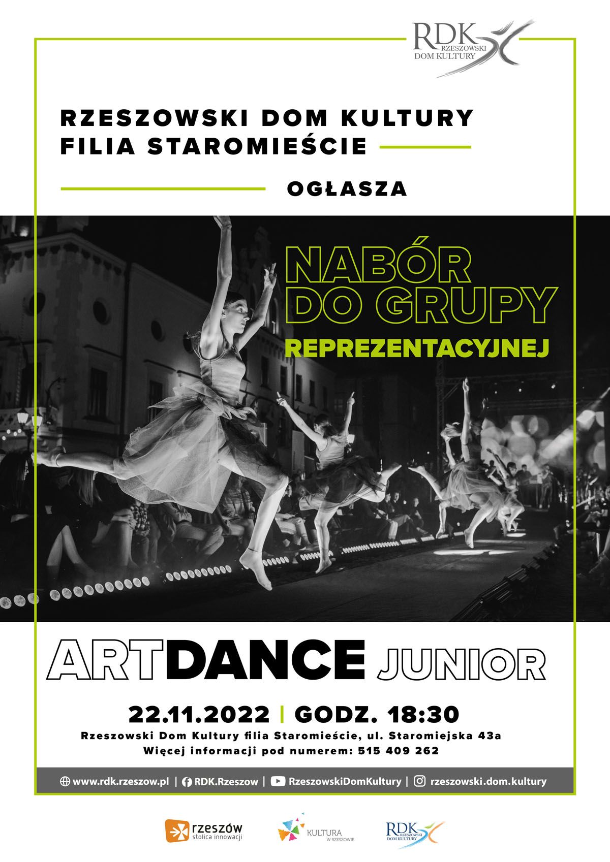 Nabór do grupy reprezentacyjnej ArtDance Junior odbędzie się we wtorek 22 listopada 2022 roku o godzinie 18:30 w Rzeszowskim Domu Kultury filia Staromieście przy ul. Staromiejskiej 43a.