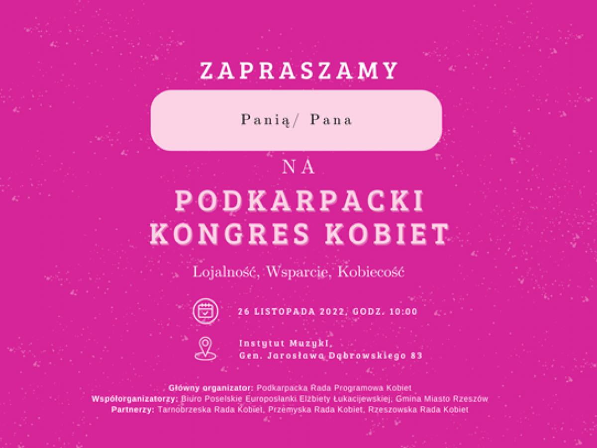 Organizator wydarzenia Podkarpacka Rada Programowa Kobiet informuje, że już w najbliższą sobotę, tj. 26 listopada 2022 r. odbędzie się doroczny i największy w województwie Podkarpacki Kongres Kobiet, w tym roku pod hasłem: „Lojalność, Wsparcie, Kobiecość”.