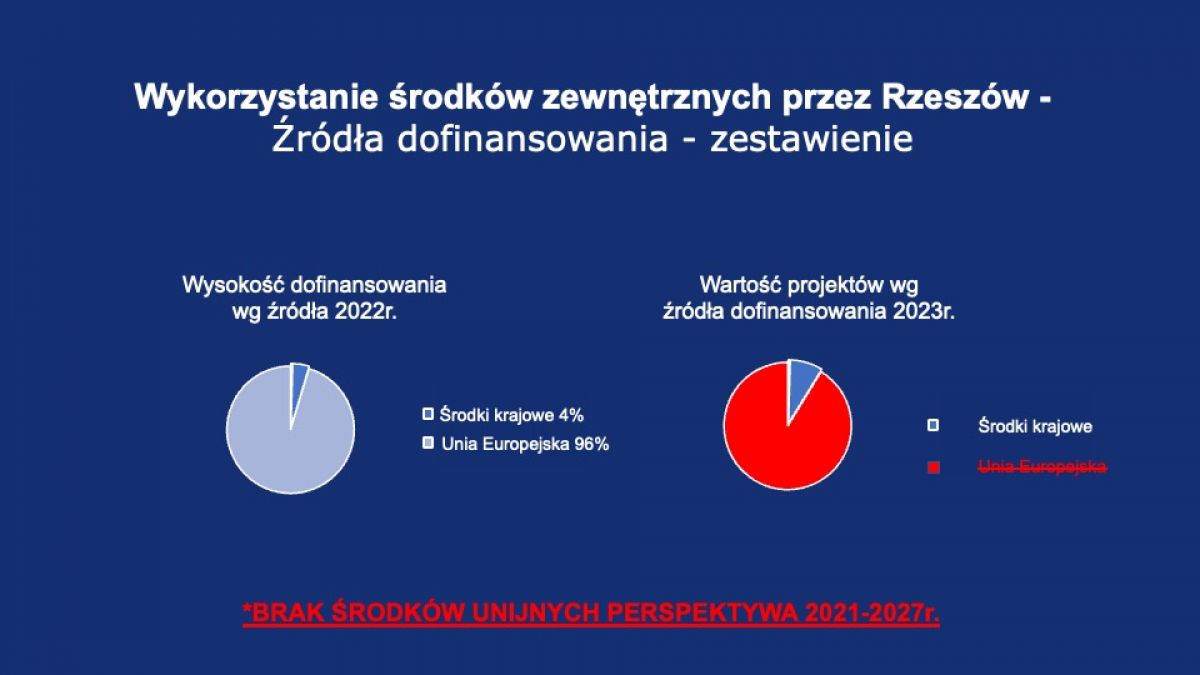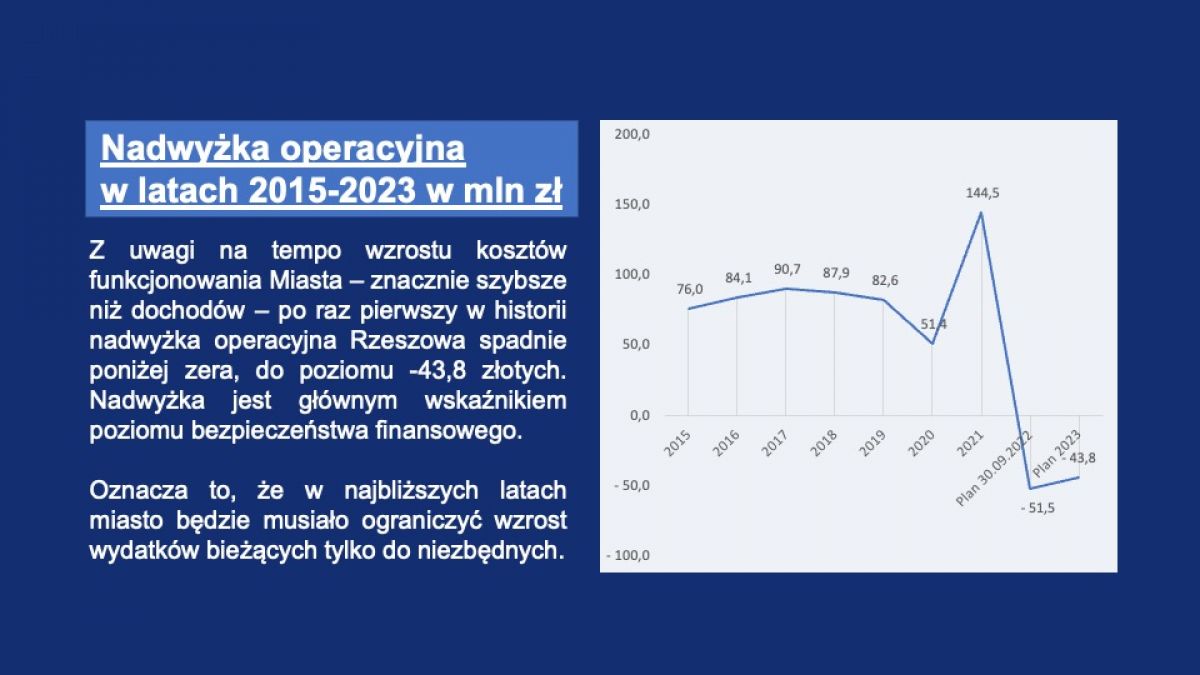 Projekt budżetu Rzeszowa na rok 2023 zakłada wydatki na poziomie ok. 1,9 mld zł. Prezydent Rzeszowa, podczas wtorkowej debaty zwracał uwagę na radykalny spadek dochodów bieżących. - W związku z trudną sytuacją, wynikającą z obniżenia wpływów z PIT, zmian podatkowych, inflacji, kryzysu energetycznego musieliśmy ściąć wydatki bieżące, zapotrzebowania wydziałów, jednostek miasta, mieszkańców, stowarzyszeń aż o 250 mln zł. Pomimo tego i tak będziemy o ponad 43 mln zł na minusie – tyle wyniesie deficyt w wydatkach bieżących – podkreślał prezydent. - Według raportów, które przygotowuje Unia Metropolii Polskich, skumulowane ubytki dochodów PIT w Rzeszowie, które powstały w wyniku zmian polityki państwa, to kwota aż ponad 370 mln zł – dodał Konrad Fijołek.