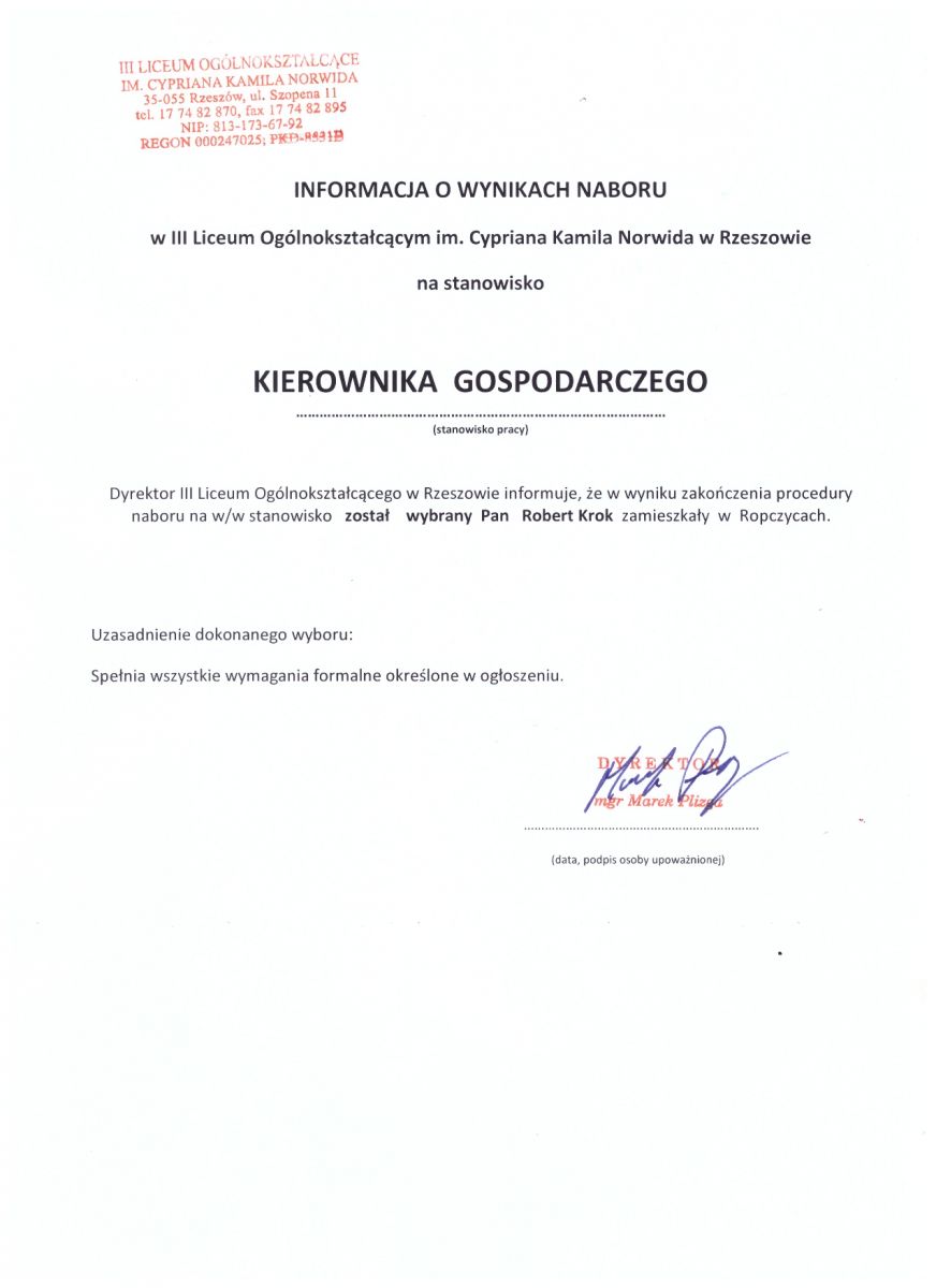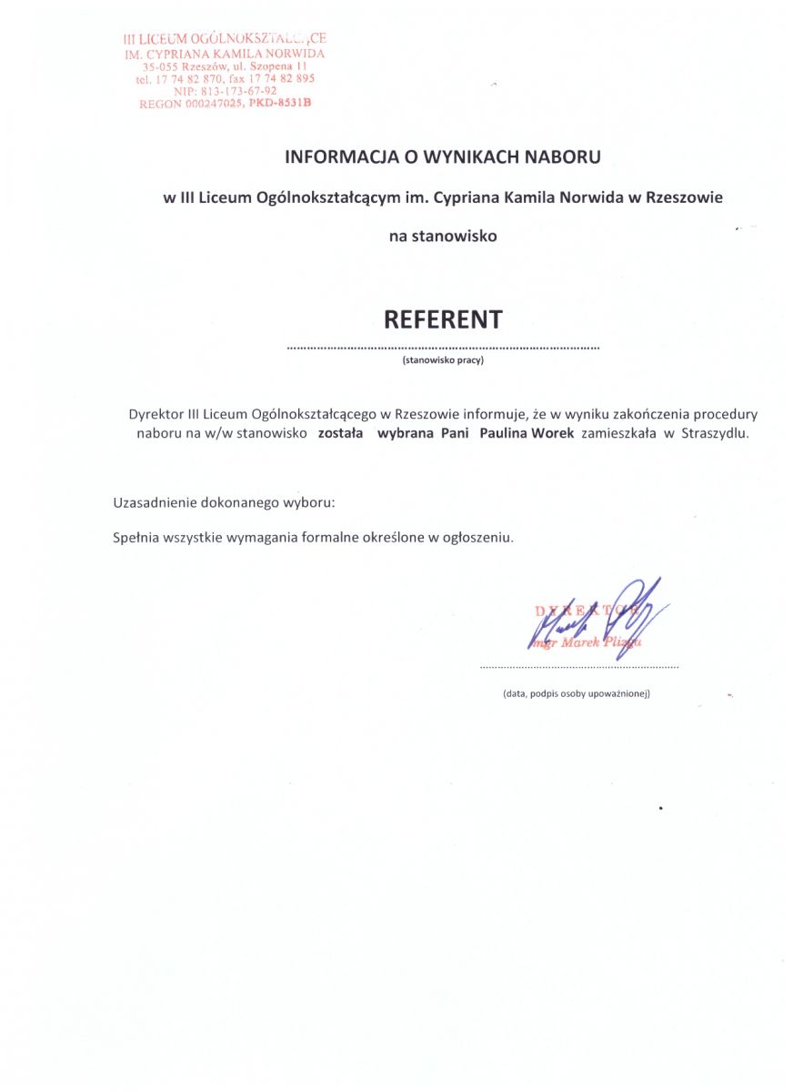 Podmiot udostępniający informację: III Liceum Ogólnokształcące im. Cypriana Kamila Norwida w Rzeszowie